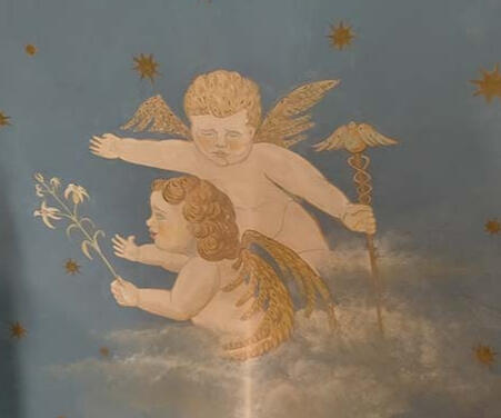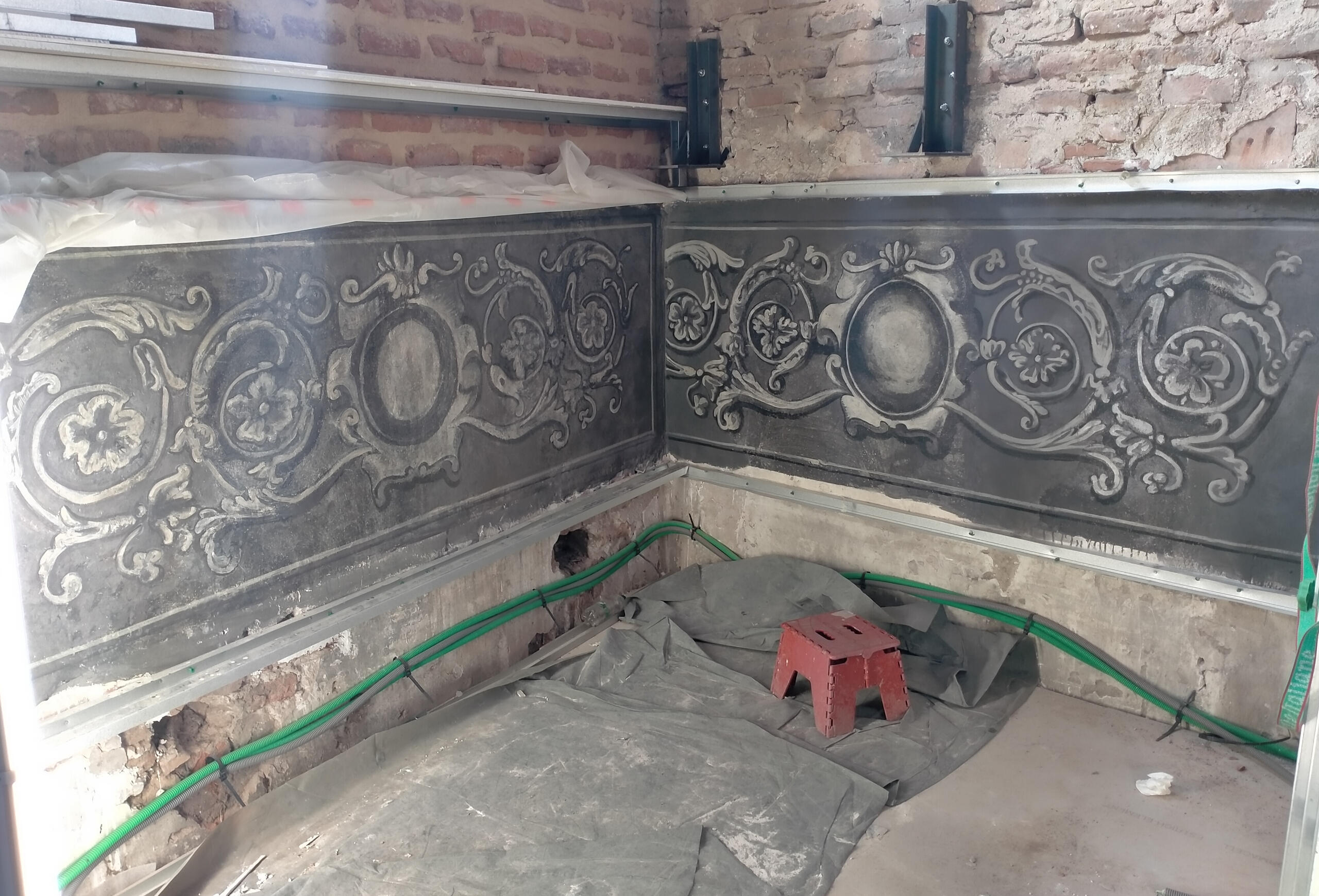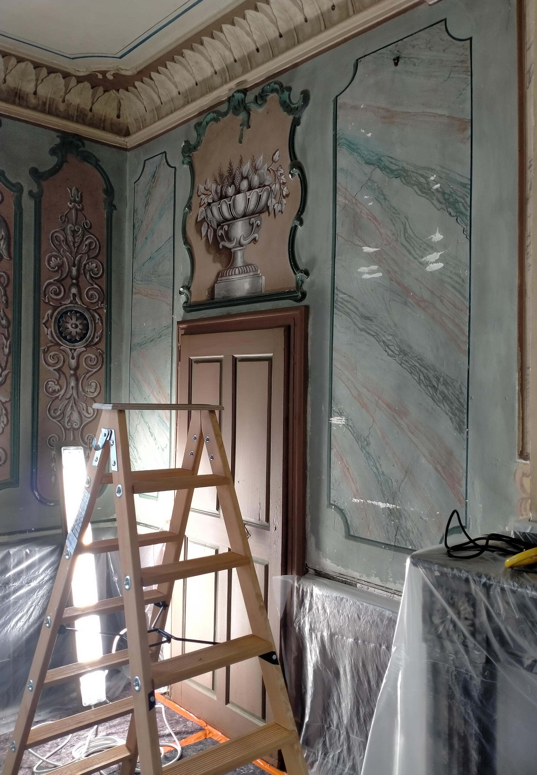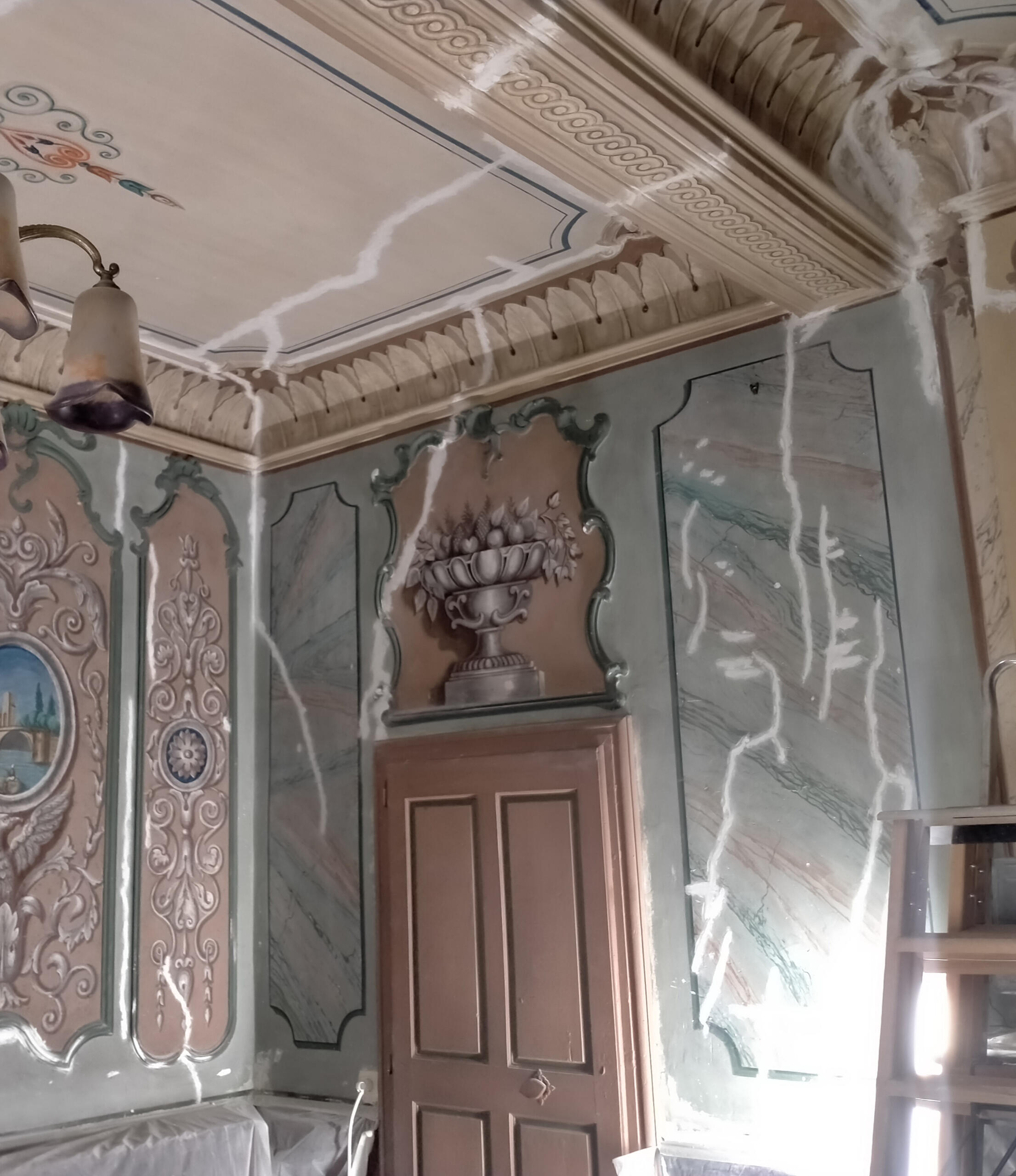 C'est une restauration qui a demandé un nettoyage du décor, une fixation de la détrempe, un traitement des fissures, de la consolidation. Il a fallu réintégrer au décor toutes nos interventions.
