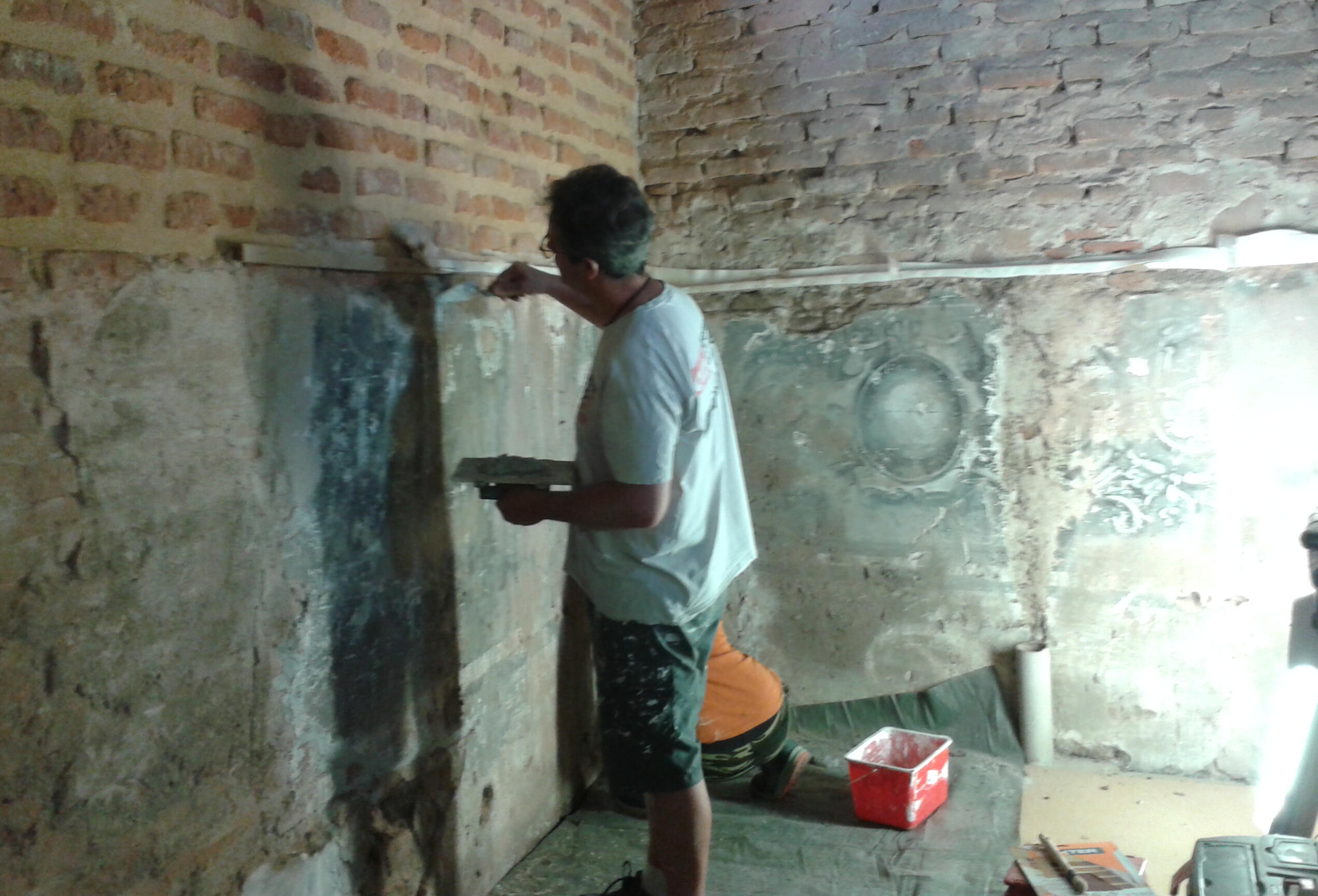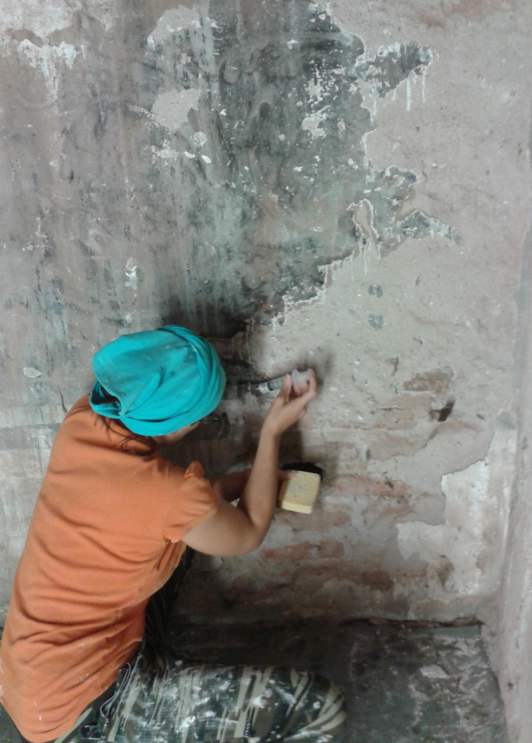 Etape: Consolidation, injection et nettoyage. Réalisation d'un solin autour du décor existant. Enduits mince à la chaux et préparation d'une peinture détrempe à base de caséïne. Intégration du décor et restitution du décor manquant 3 valeurs en dessous de l'existant.
