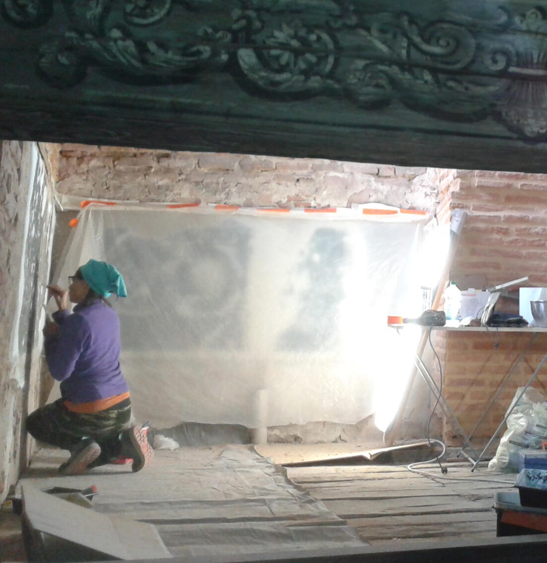C'est une restauration qui a demandé un nettoyage du décor, une fixation de la détrempe, un traitement des fissures, de la consolidation. Il a fallu réintégrer au décor toutes nos interventions.